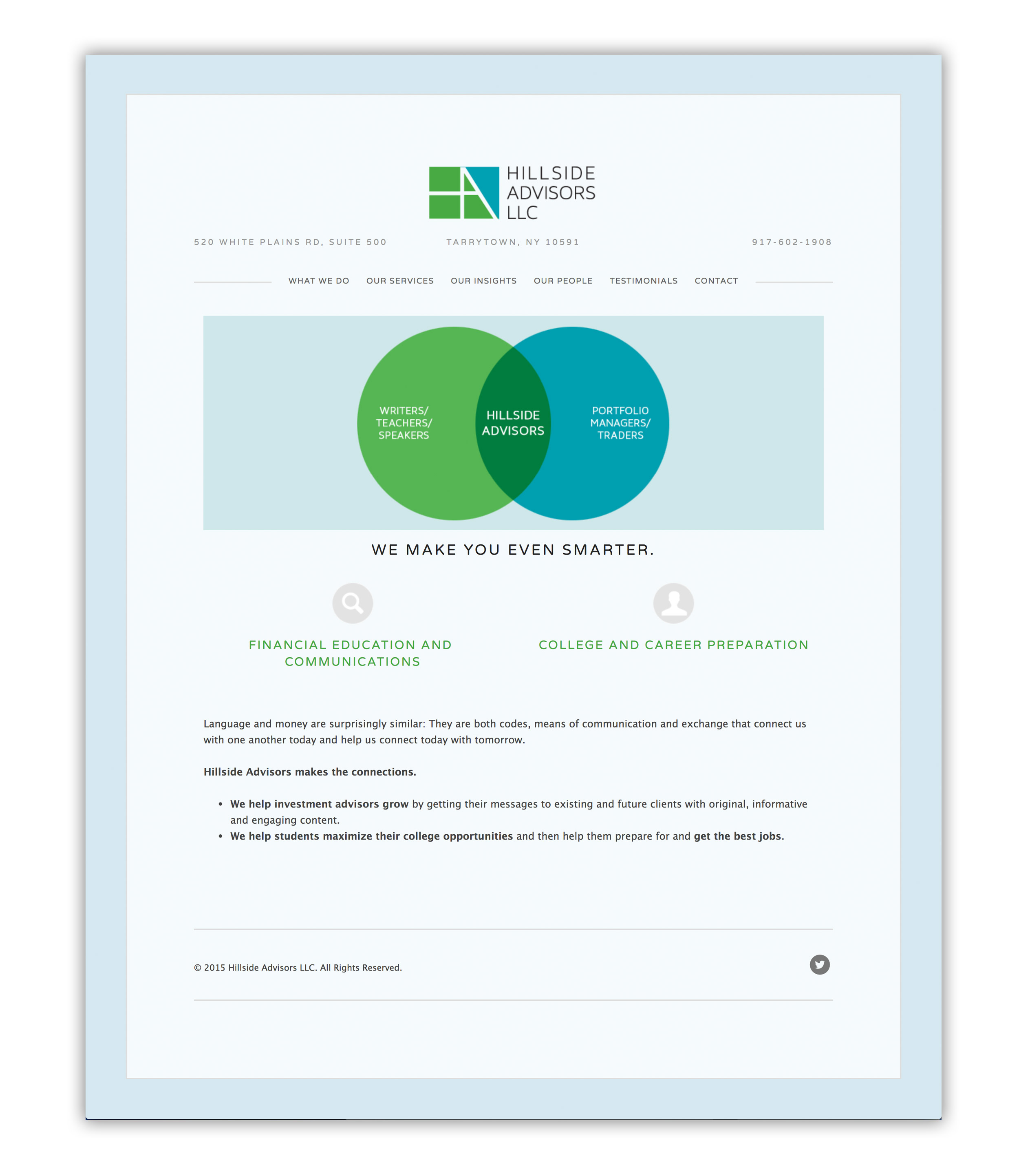 Hillside Advisors Hillside Advisors was an independent research and wealth management firm. The website was part of a branding project which also included the design of a logo, business card and stationery.