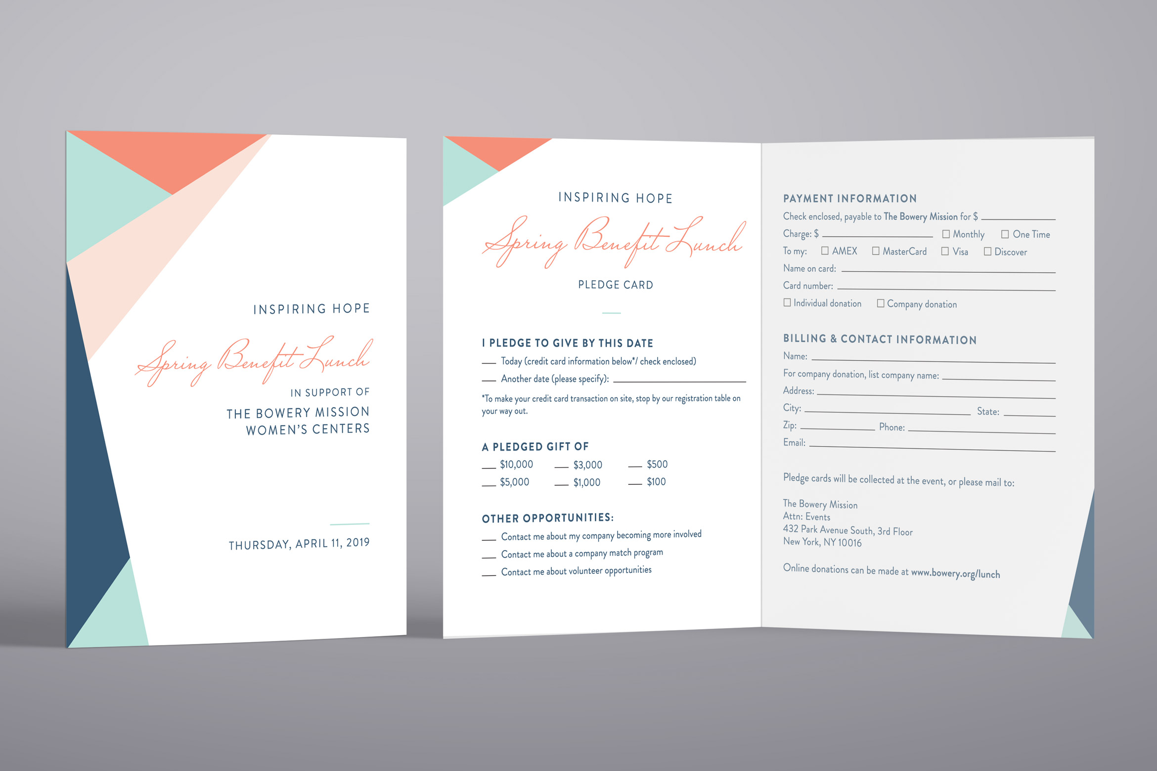 Inspiring Hope Spring Benefit Lunch Promotional materials for The Bowery Mission's spring fundraising luncheon included invite, pledge card, program and menu.